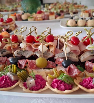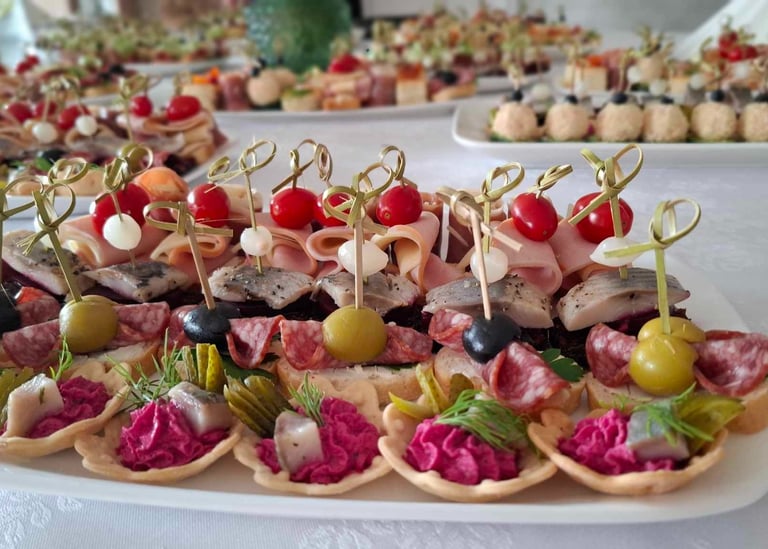 Kiekvienas sumuštinukas kruopščiai suderintas – tiek skoniu, tiek vaizdu. Puošiame šviežiomis daržovėmis, žalumynais ar kitais akcentais. Galime priderinti ir prie šventinės tematikos, naudoti dekoratyvinius smeigtukus, personalizuotus papuošimus ar sudėti į rinkinį.